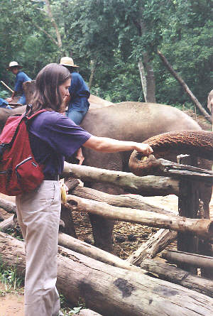 Vormittags stand der Besuch eines Elefantencamps auf dem Programm. Nachdem wir uns ausreichend mit Bananen versorgt hatten, konnten wir die Dickhäuter erst einmal füttern. Nachher gab´s ein ausgiebiges Bad im Fluss, was die Tiere sichtlich genossen. Da es sich in den Camps in erster Linie um ehemalige Arbeitselefanten handelt,